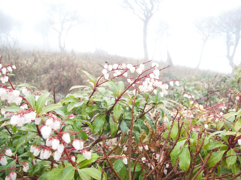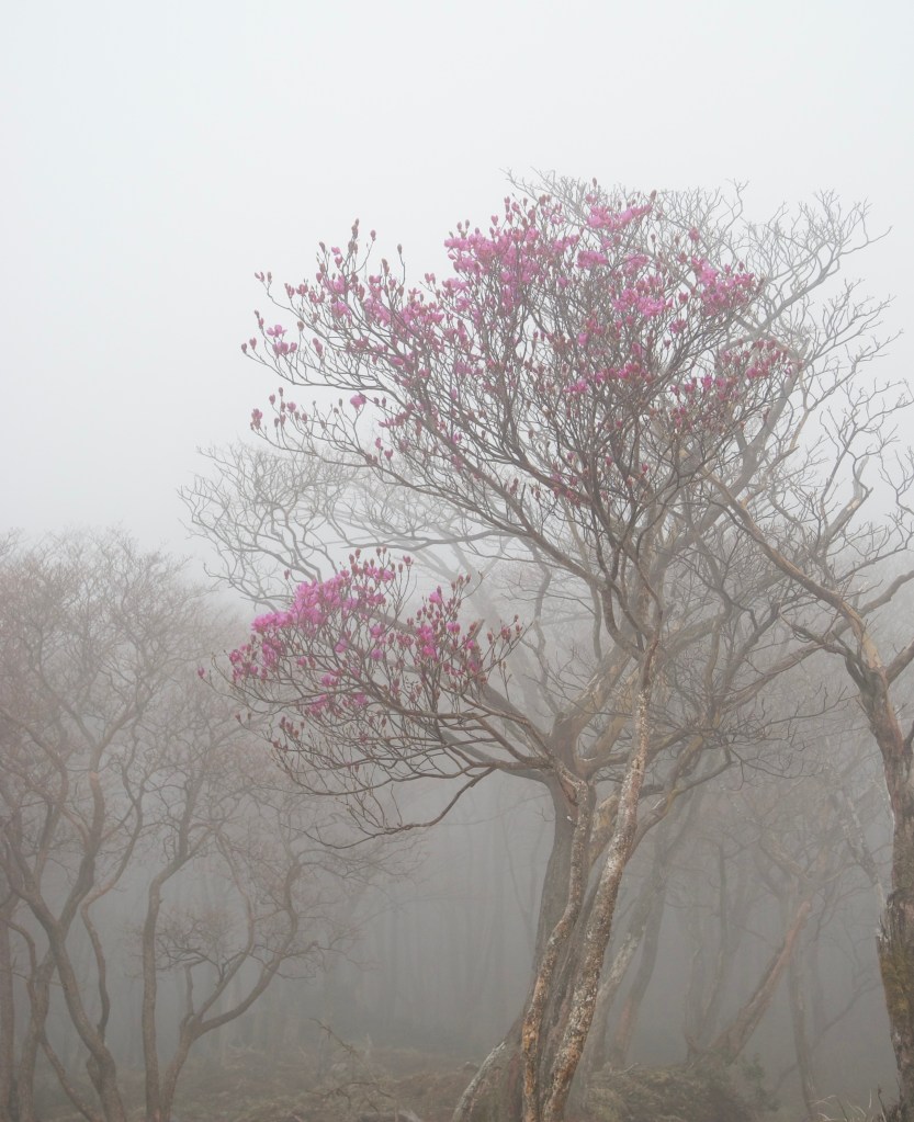 On the pale red rhododendrons