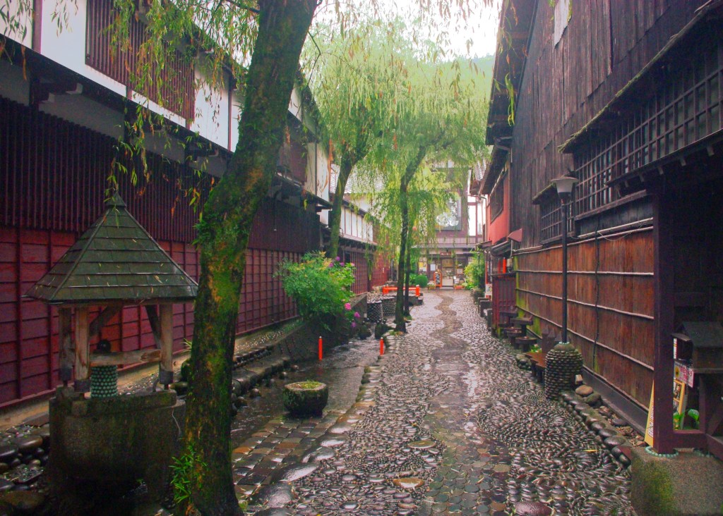 The open-air bath with shimmering willows